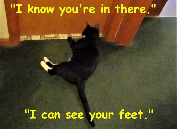 This was so funny. My granddaughter was the one in the bathroom and she wished she had her phone with her so she could take pic from the other side of the white paws that kept reaching under the door.