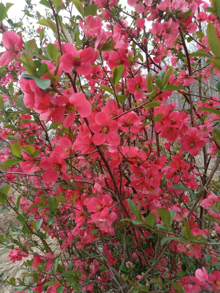 The Flowering Quince bushes are in full bloom now, filling the garden with glorious color.
