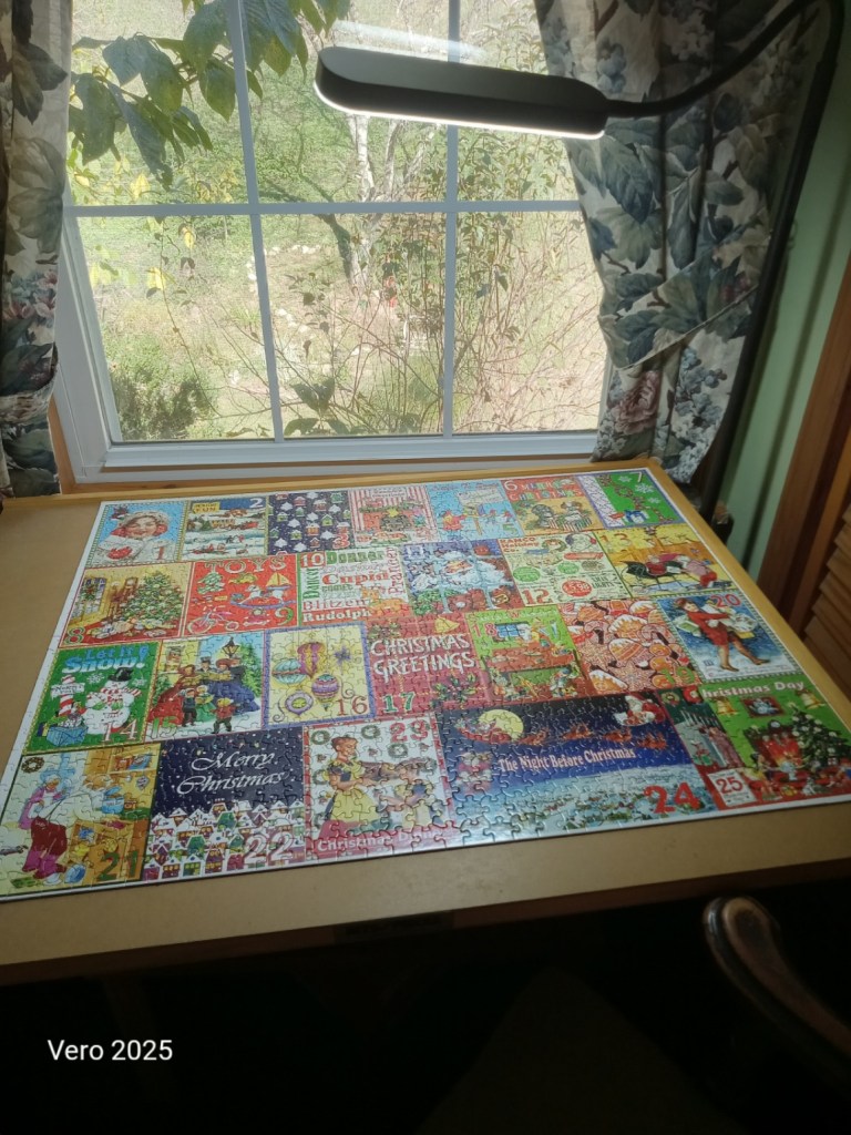 I do believe I forgot to post a picture of my finished 1000 piece Advent puzzle. (The one that is all in the same box, not the one in multiple little boxes). I posted it on another site but neglected to share it here. It didn’t take me nearly as long to work it as I thought it would.